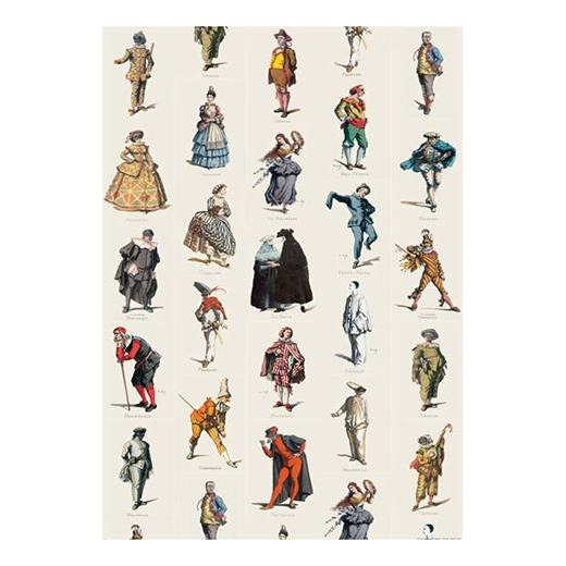 A poster featuring characters from the improvised comedy "Commedia dell'arte," which originated in Italy around the 16th century.