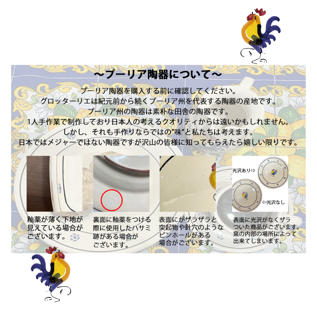 プーリア陶器の特性についてご理解いただいた上でのご購入をお願いいたします。