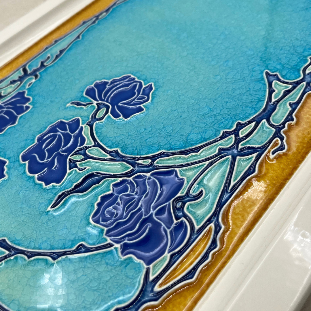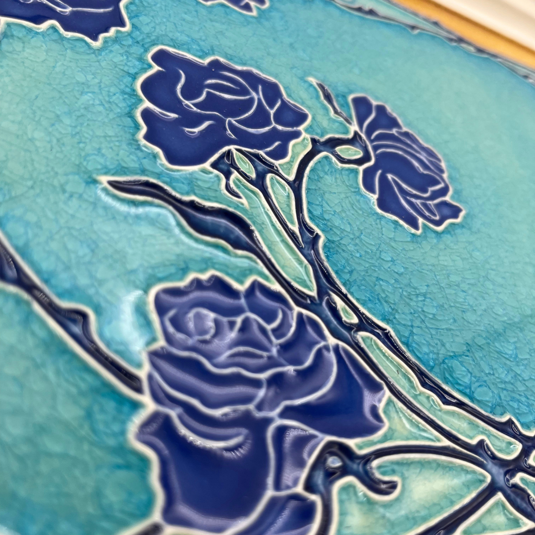 ターコイズブルーがとても綺麗な作品で濃いめのブルーのバラが装飾されています。