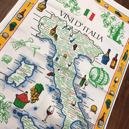 イタリアのワインの産地、ブドウ品種が描かれています。