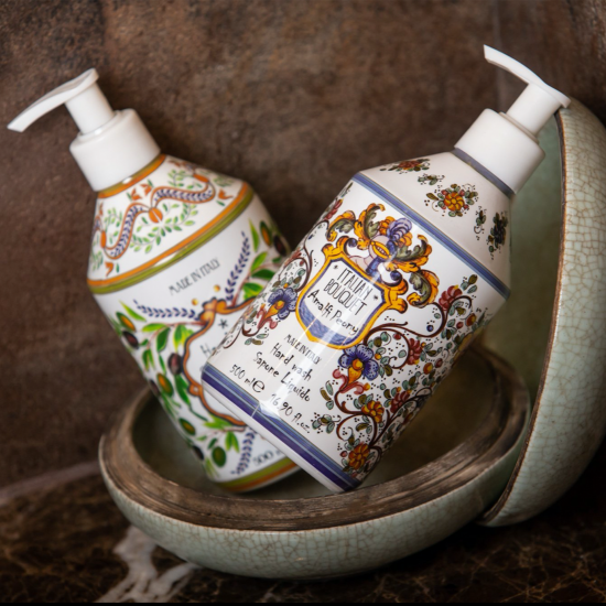 オーガニックアロエベラエキス、植物由来グリセリン、ビタミンE誘導体配合の肌に優しいハンドウォッシュ 。アロエの美肌作用とクエン酸のph調整作用により、潤いを適度に残しながら洗い上げます。イタリア各地の特産を表現した柄や香りを施し、爽やかで優雅なアロマをご堪能ください。