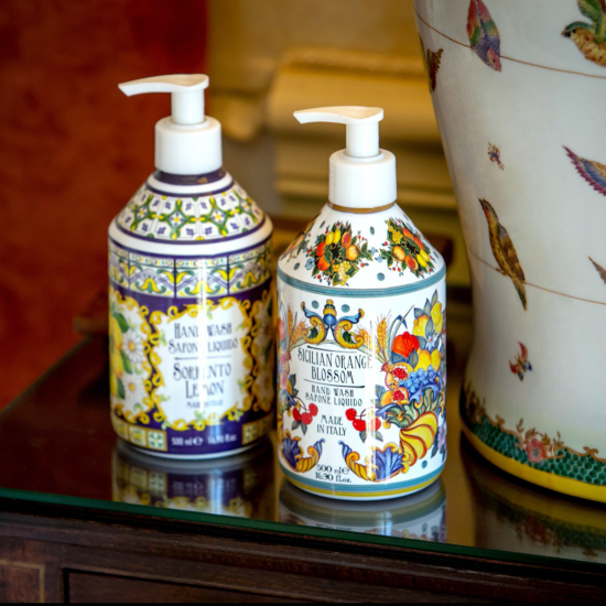 オーガニックアロエベラエキス、植物由来グリセリン、ビタミンE誘導体配合の肌に優しいハンドウォッシュ 。アロエの美肌作用とクエン酸のph調整作用により、潤いを適度に残しながら洗い上げます。イタリア各地の特産を表現した柄や香りを施し、爽やかで優雅なアロマをご堪能ください。