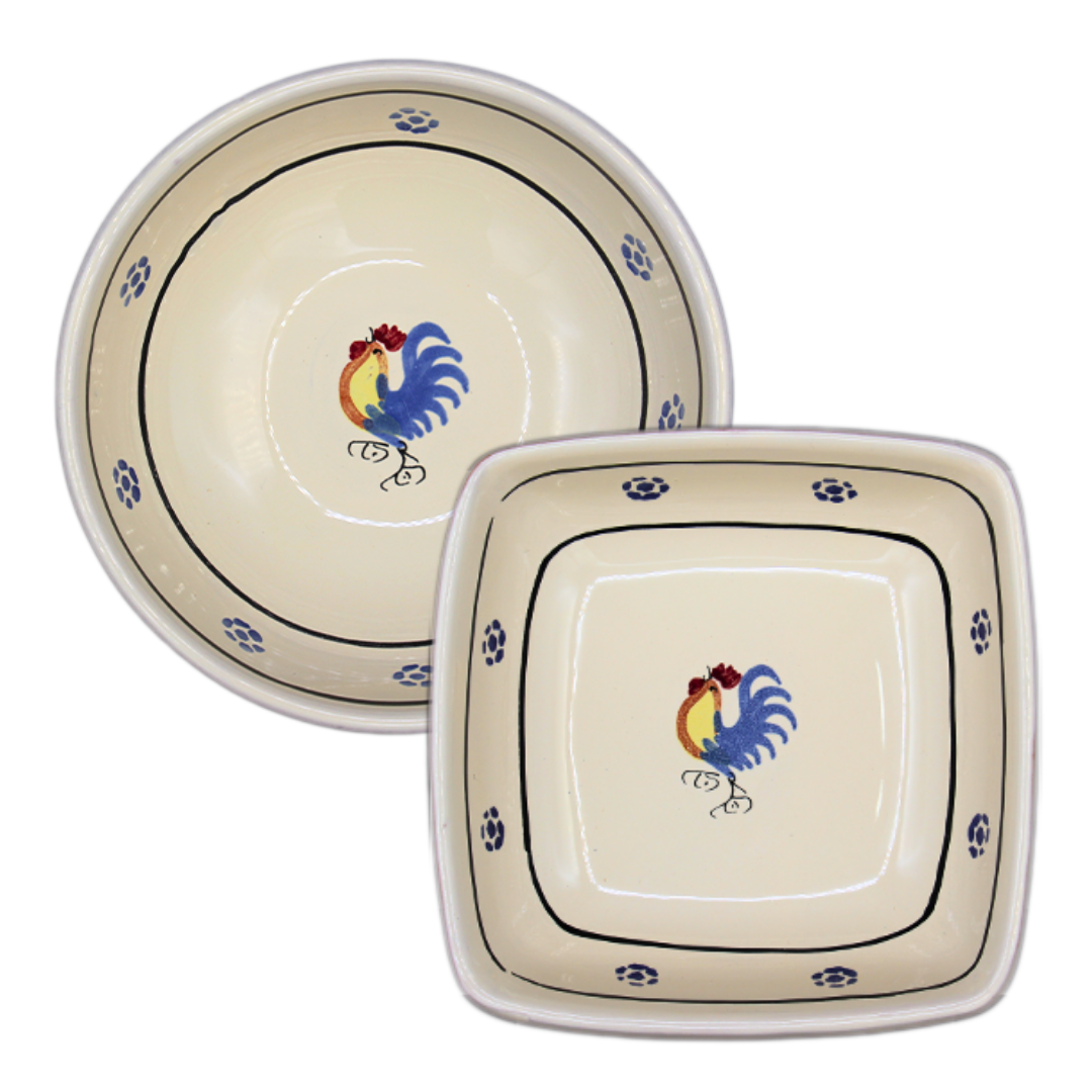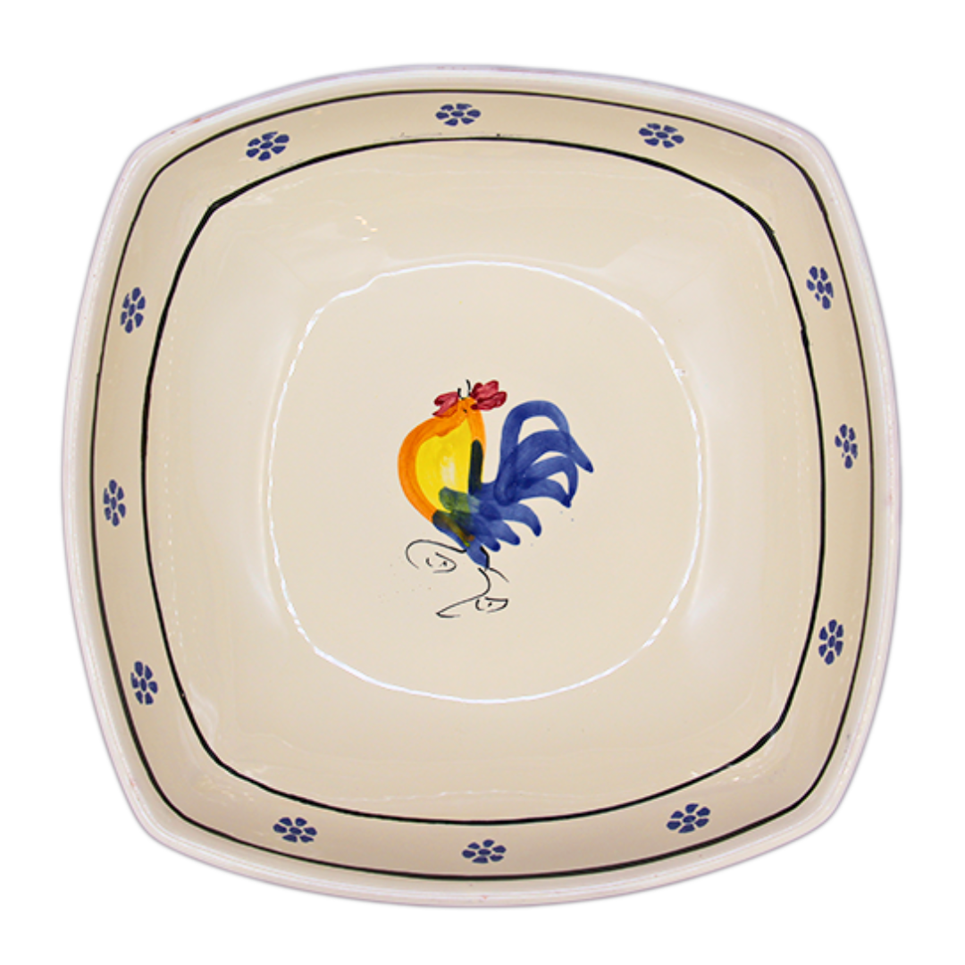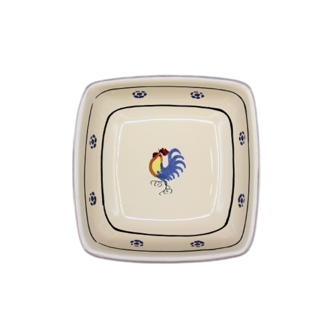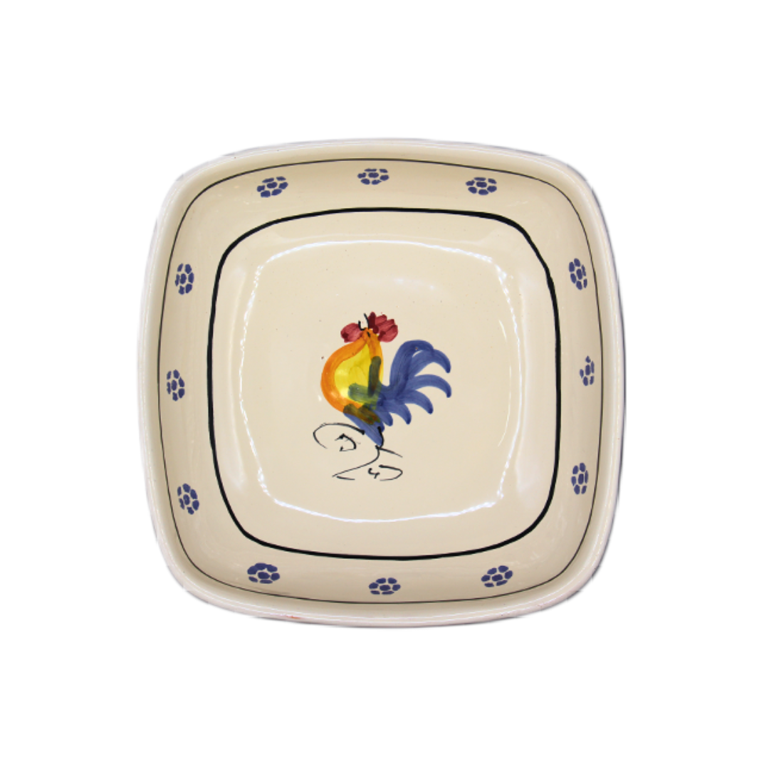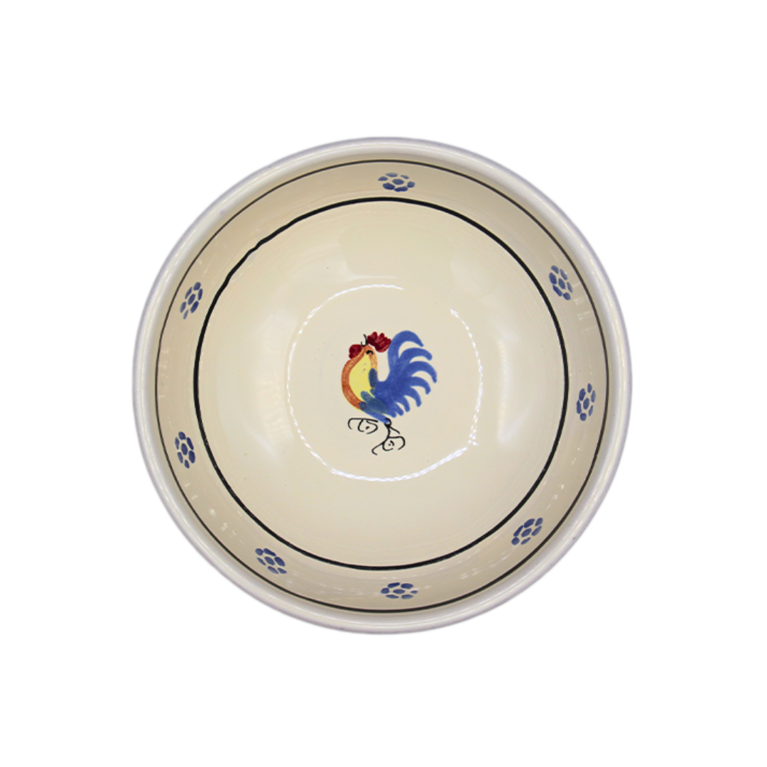 プーリアの伝統陶器で、下地の釉薬はクリーム色をしているため、独特な温かみを感じる色合いになります。 魔除けの象徴とされるにわとりと星形が描かれています。
