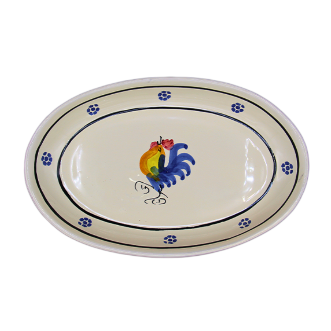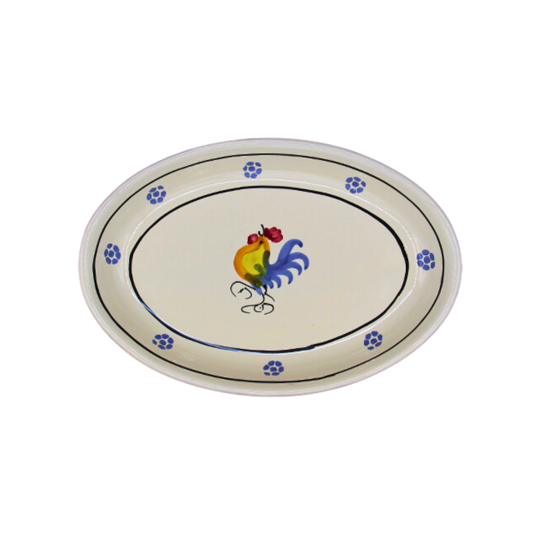 プーリアの伝統陶器で、下地の釉薬はクリーム色をしているため、独特な温かみを感じる色合いになります。 魔除けの象徴とされるにわとりと星形が描かれています。