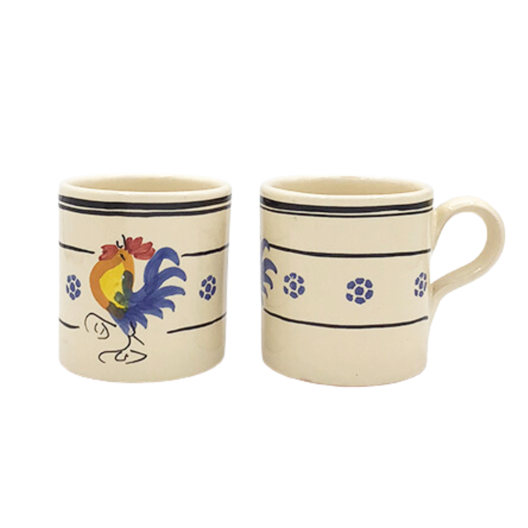 プーリアの伝統陶器で、下地の釉薬はクリーム色をしているため、独特な温かみを感じる色合いになります。 魔除けの象徴とされるにわとりと星形が描かれています。