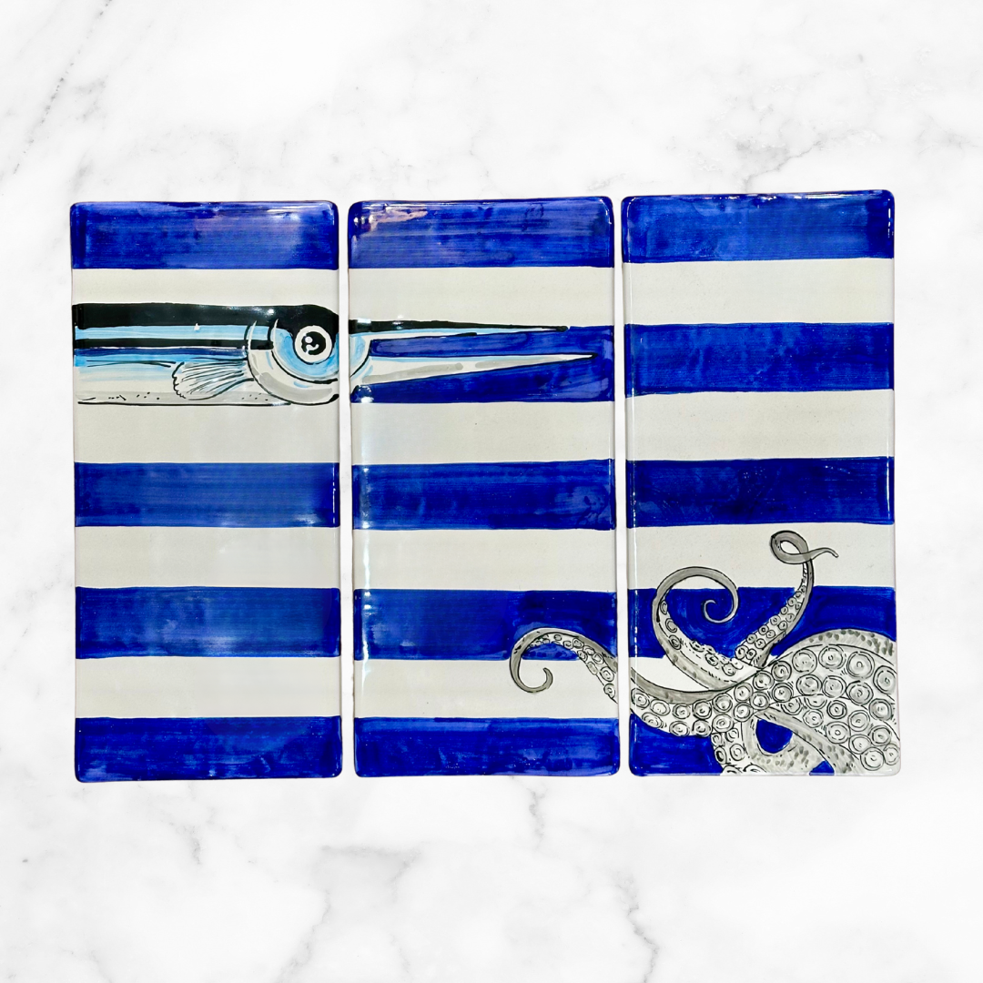 パズルのような魚とタコのデザインが斬新な、平らなスクエアプレート3枚セット。