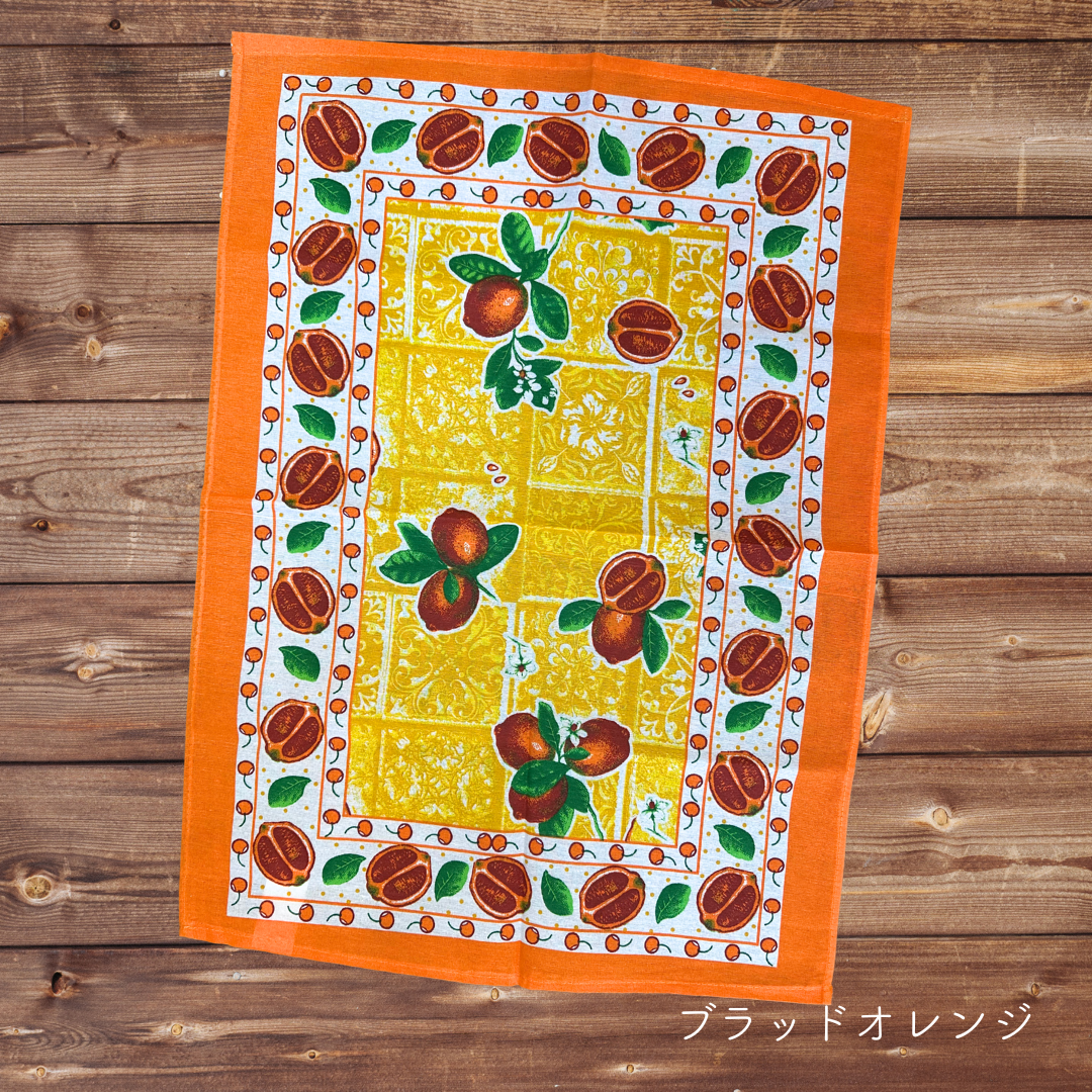ブラッドオレンジが描かれた鮮やかなタペストリーです。
