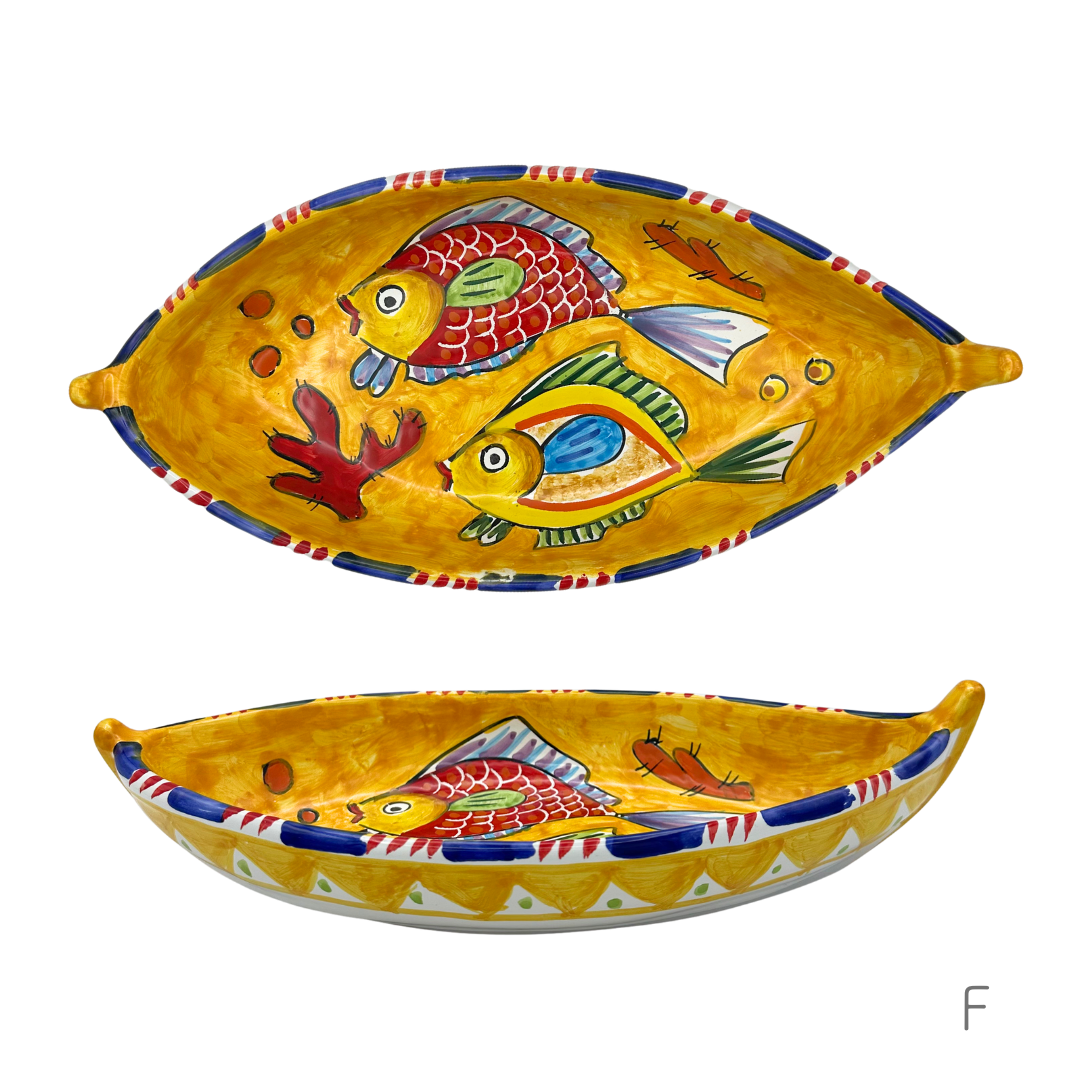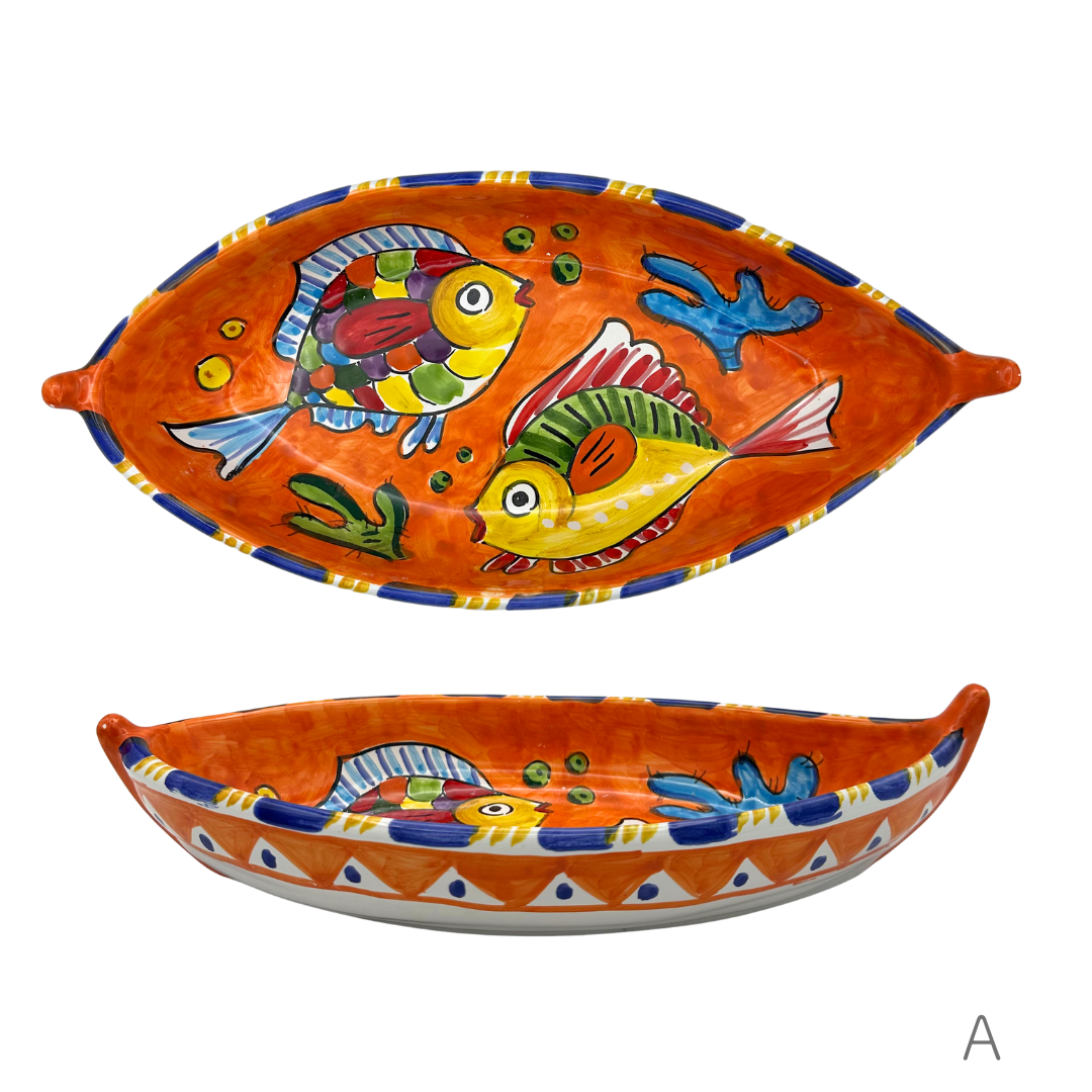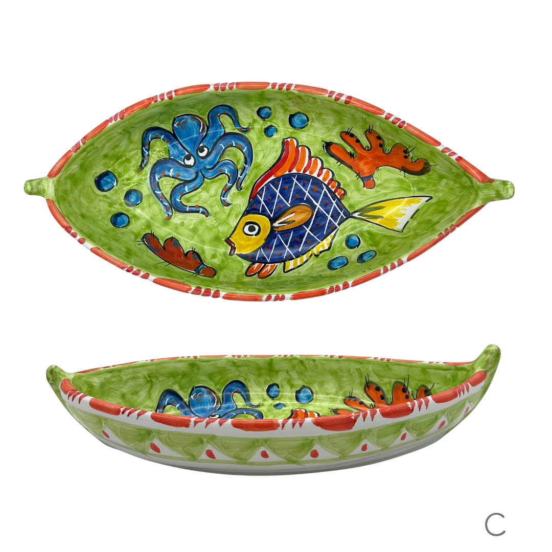 可愛らしい表情の魚やタコが描かれたボート型の大皿です。