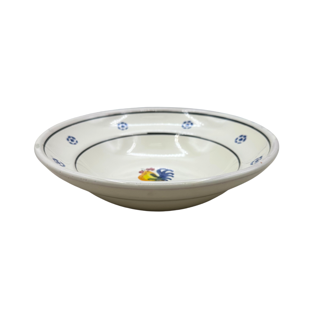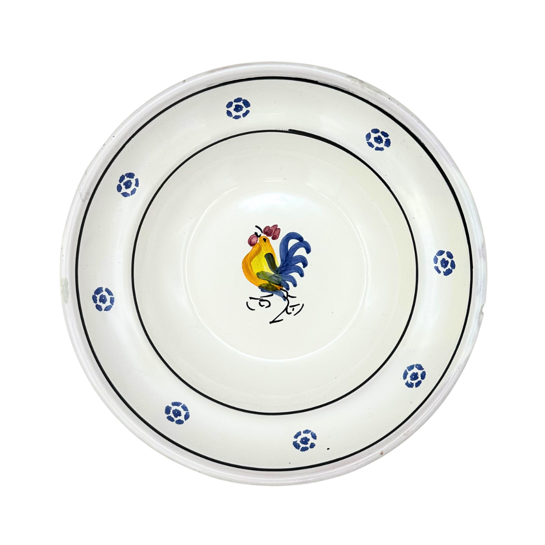 プーリアの伝統陶器で、下地の釉薬はクリーム色をしているため、独特な温かみを感じる色合いになります。 魔除けの象徴とされるにわとりと星形が描かれています。
