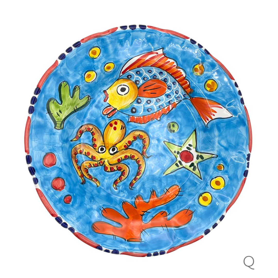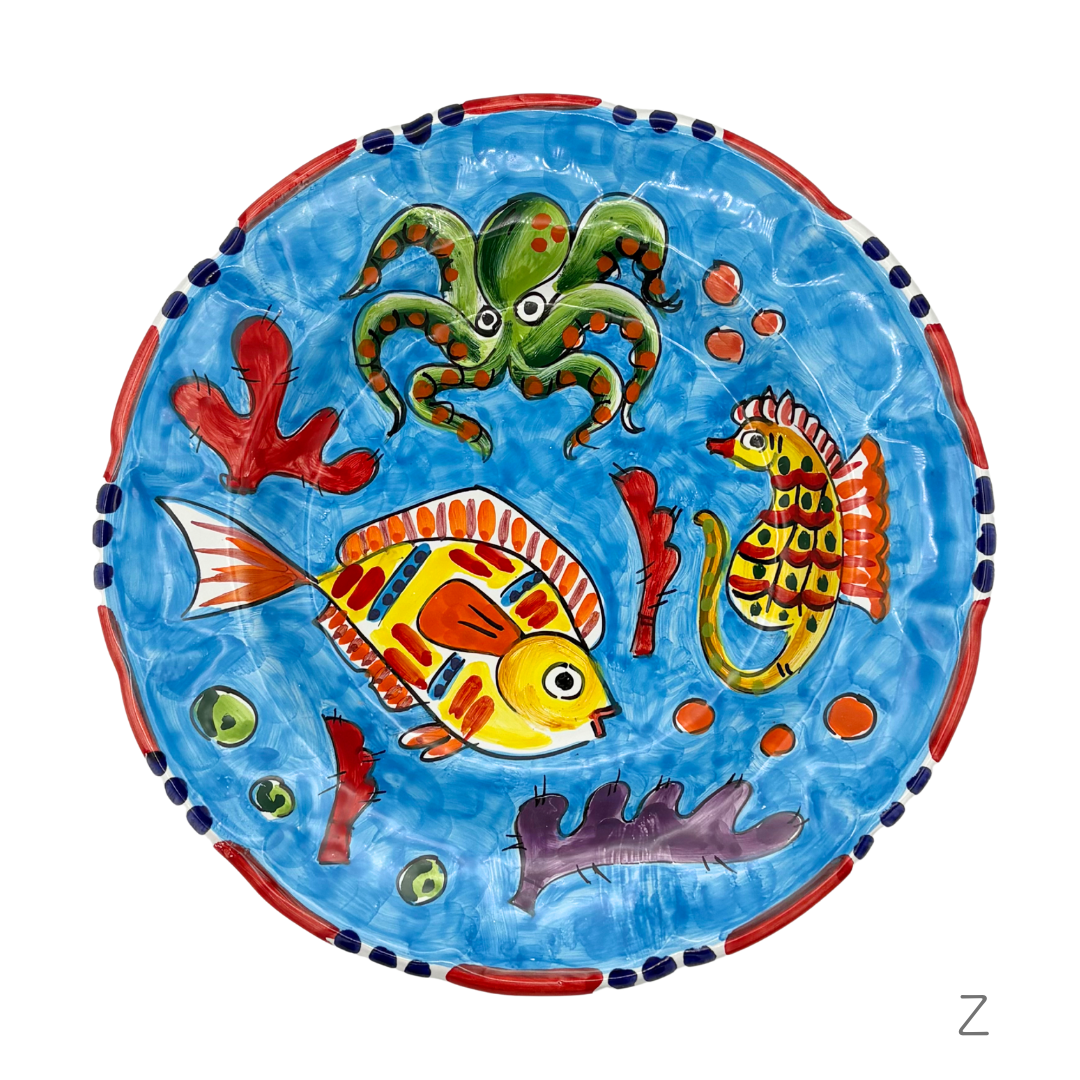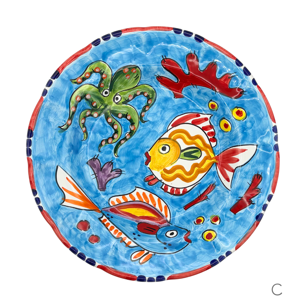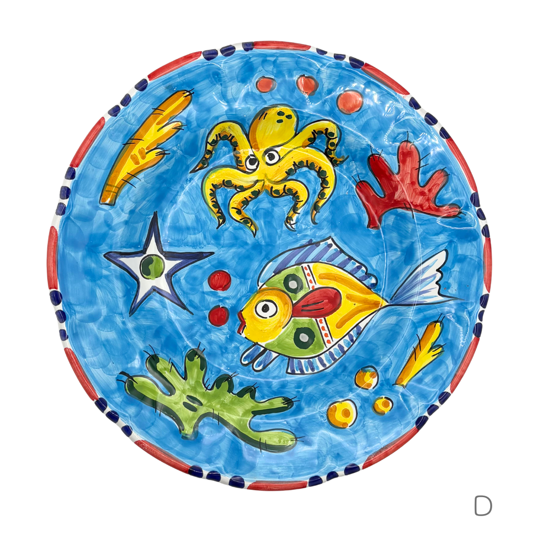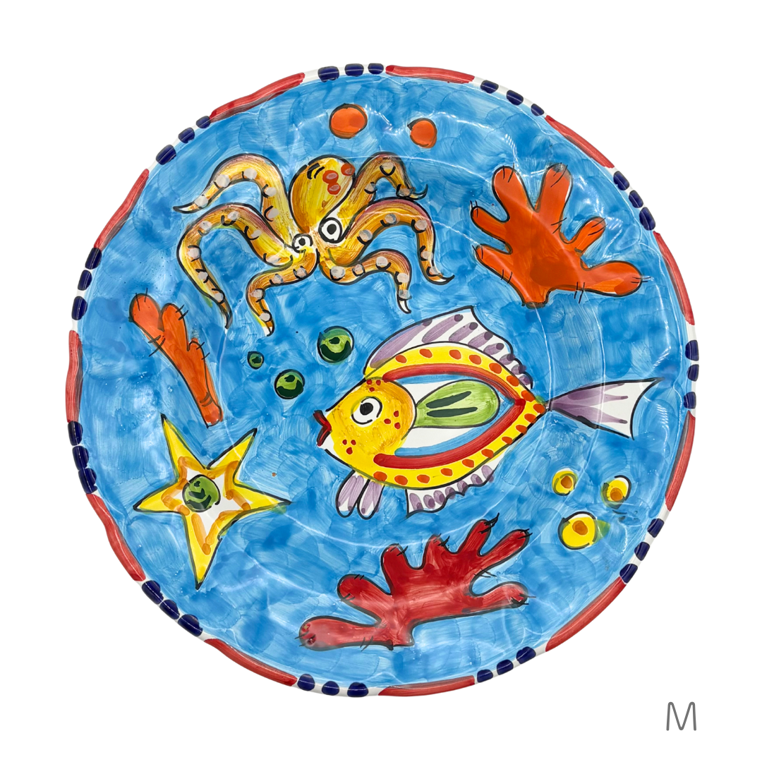可愛らしい表情の魚やタコが描かれた、パスタやカレー、シチューなどにぴったりのお皿です。