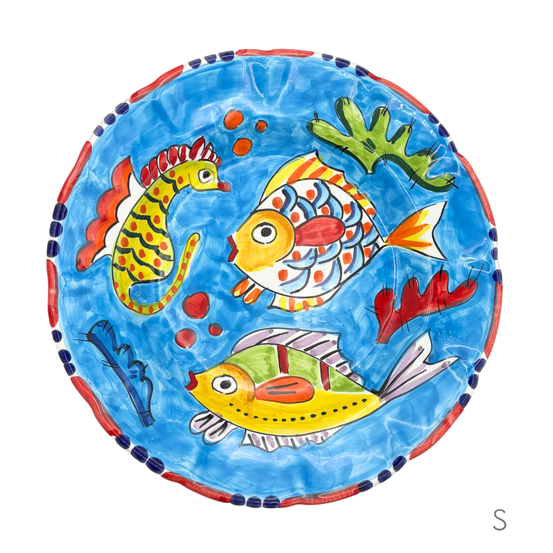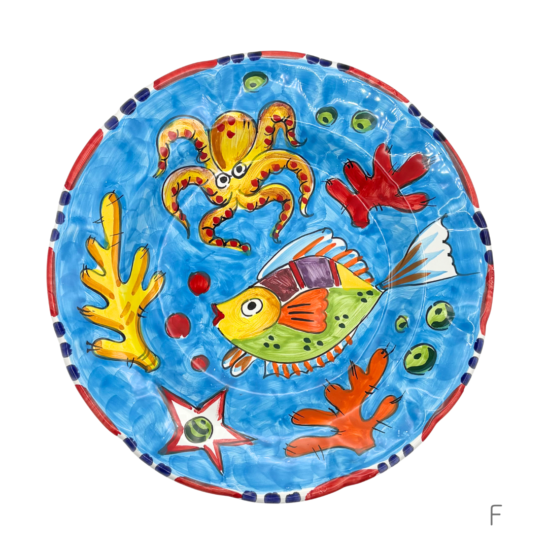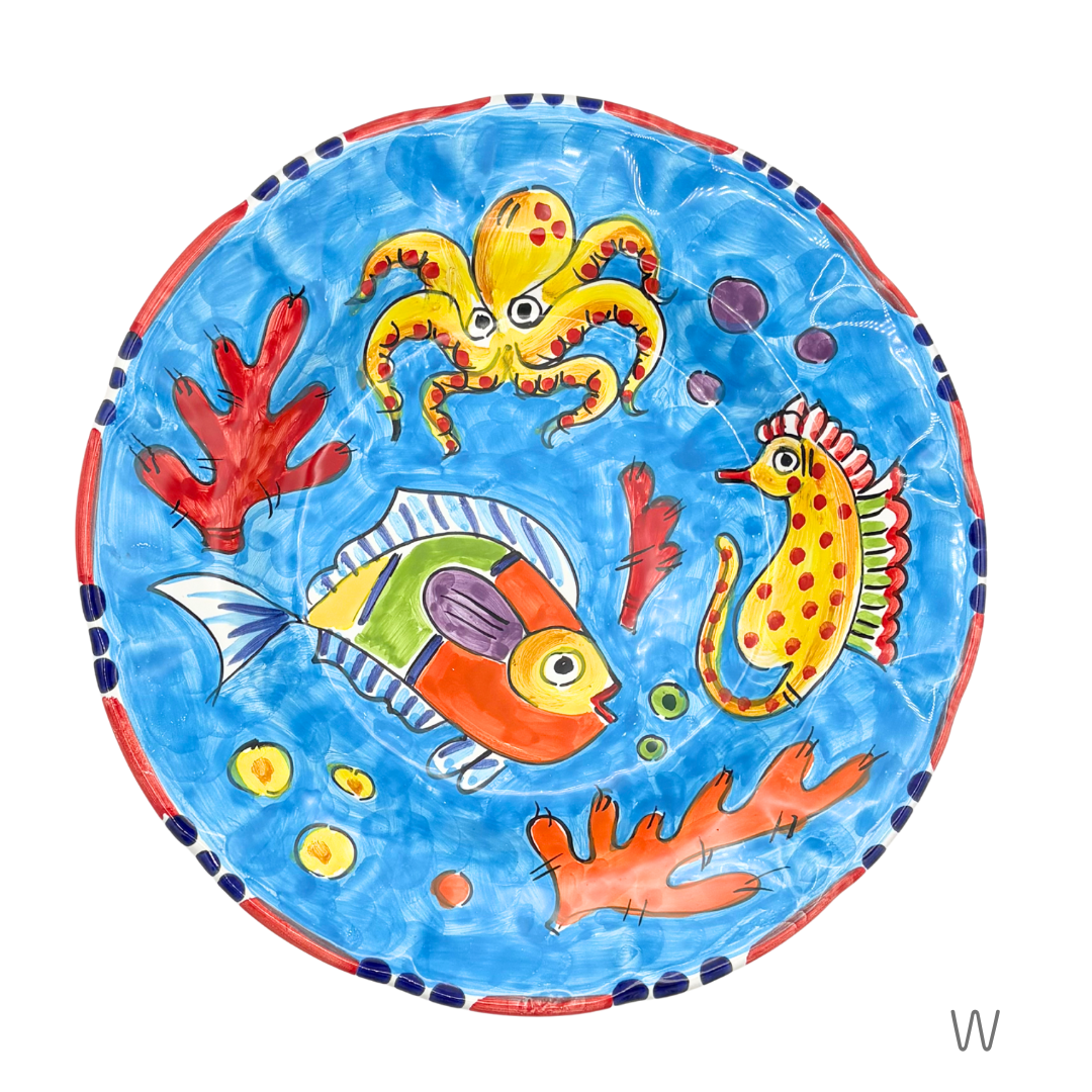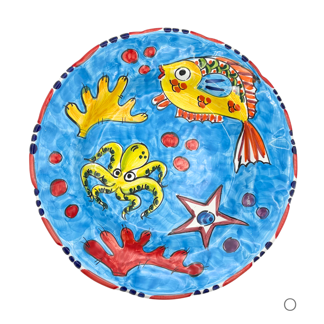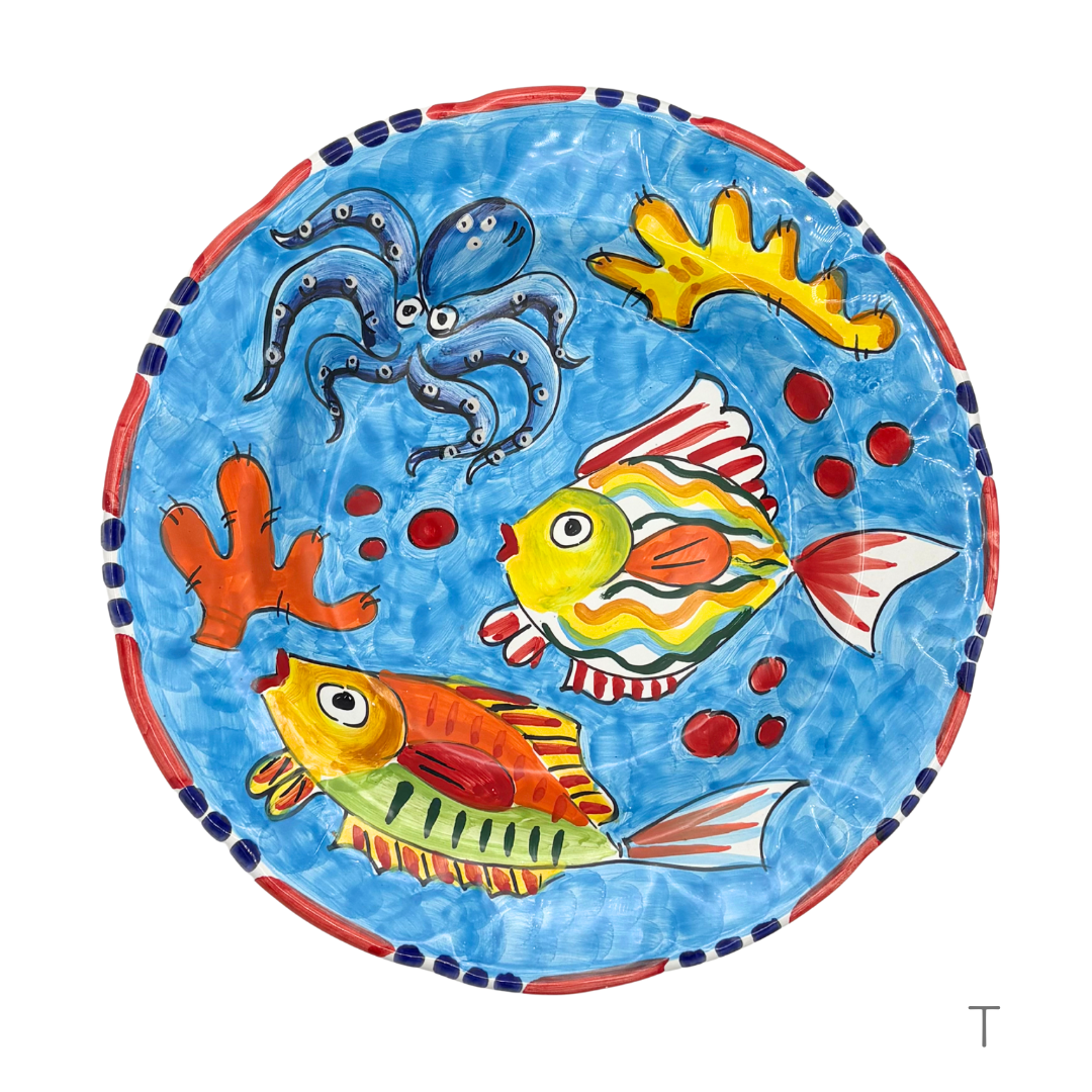 可愛らしい表情の魚やタコが描かれた、パスタやカレー、シチューなどにぴったりのお皿です。